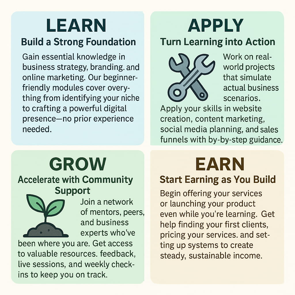 Step-by-Step Guidance — Follow structured lessons that support your progress toward building a sustainable business.